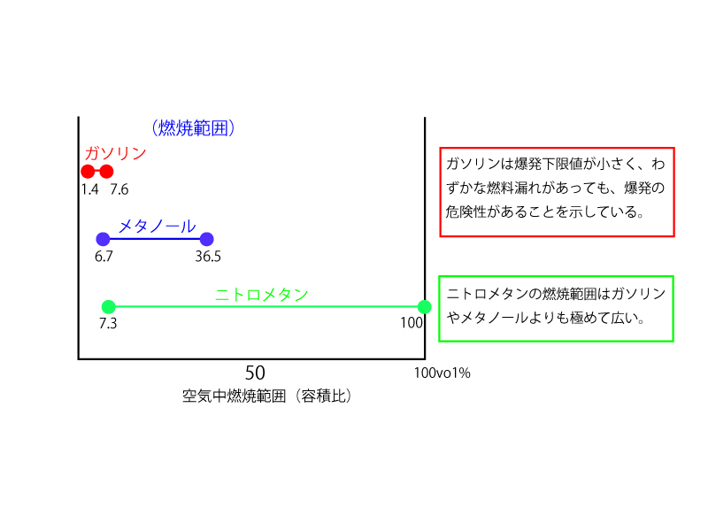 ■ニトロメタンの燃焼範囲は、下限値が7.3%でメタノールとほぼ同じですが、上限値は無限大となりメタノールよりも更に範囲が拡がって混合気がどれだけ濃くても燃焼(爆発)するという性質になり、エンジンではやや濃い目の空燃比に調整する事であらゆる運転条件に対応出来ることを示しています。そのためグロー燃料では、メタノールへ適当量のニトロメタンを添加して、エンジン調整の楽な非常に扱い易い優れた燃料とすることが可能になります。