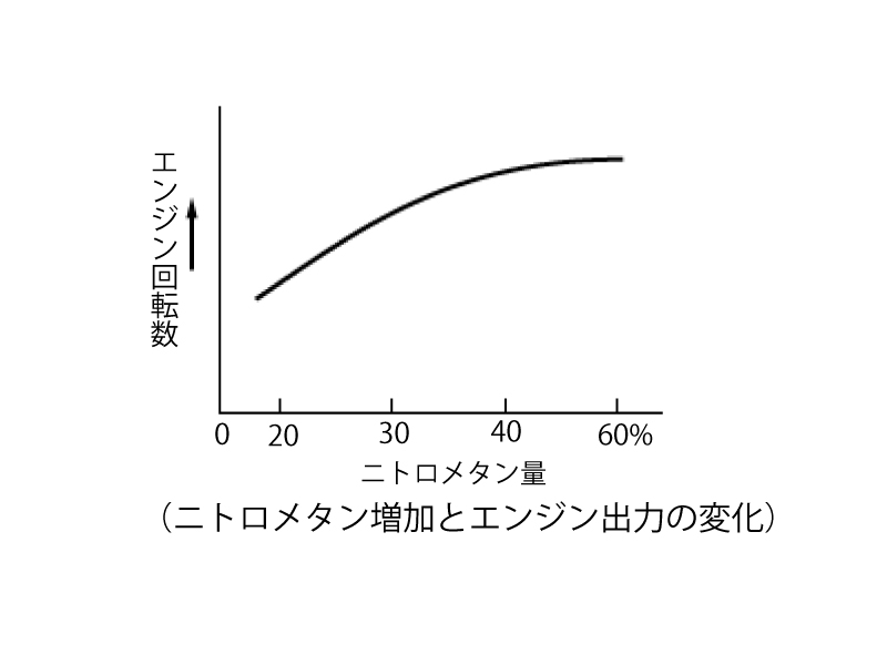 ■またニトロメタンは、メタノールよりも空燃比を「濃く」出来るためエンジンへより多くの燃料(熱量)が供給出来ること及びニトロメタンが燃焼する際に酸素の放出が極めて急で燃焼速度が速くなることから、エンジン出力(回転数)の増加が認められています。一般的に、ニトロメタンが無添加の燃料(ストレート燃料と言います)から徐々にニトロメタン量を増やしていくと、40%位までは出力が増加しそれ以上になると増加が目立たなくなる傾向が見られます。